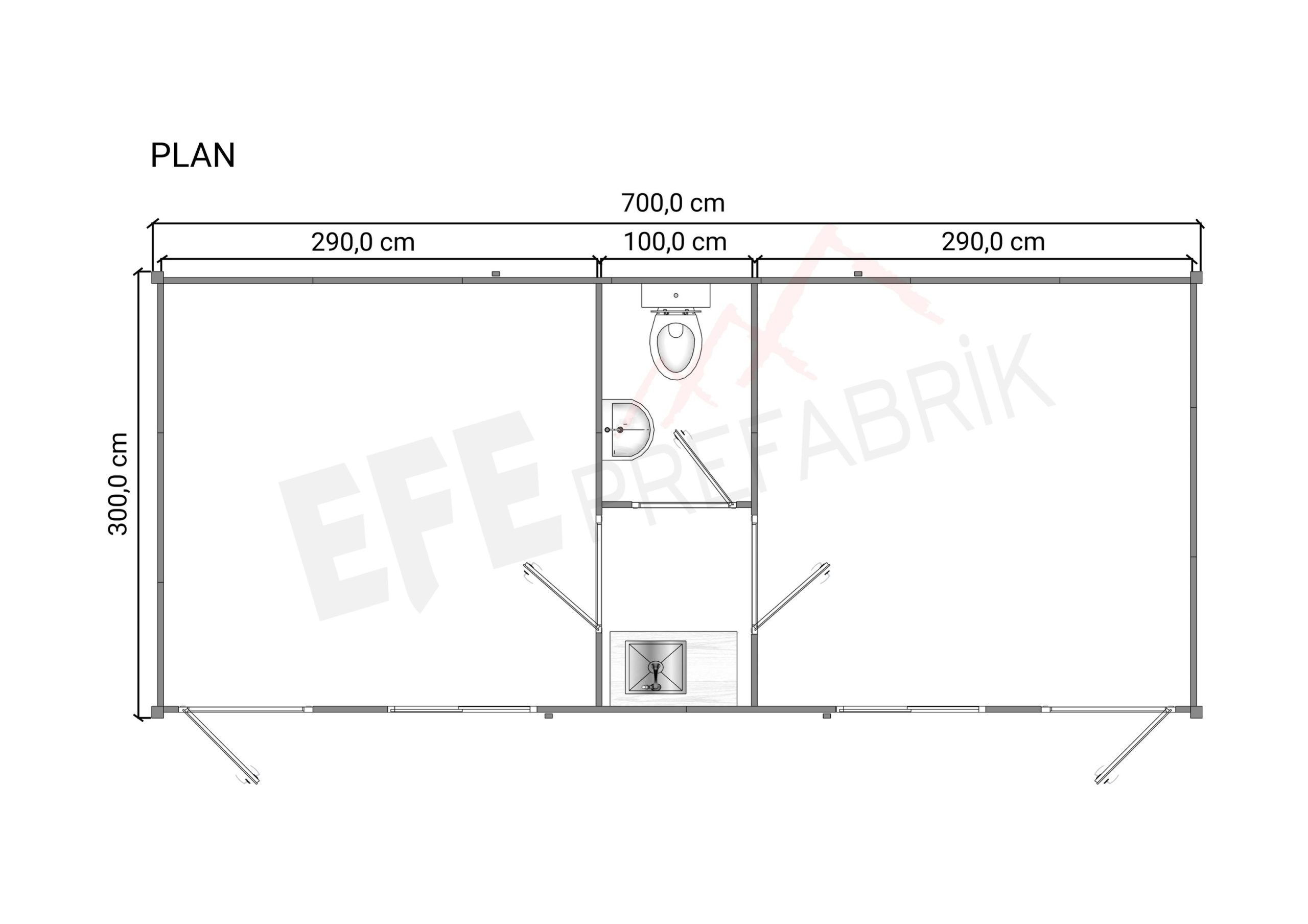 Konteyner tabanlarına güçlendirilmiş galvaniz şase üzerine 14 mm Fibercement kaplanmaktadır. Çürümez, esnemez!