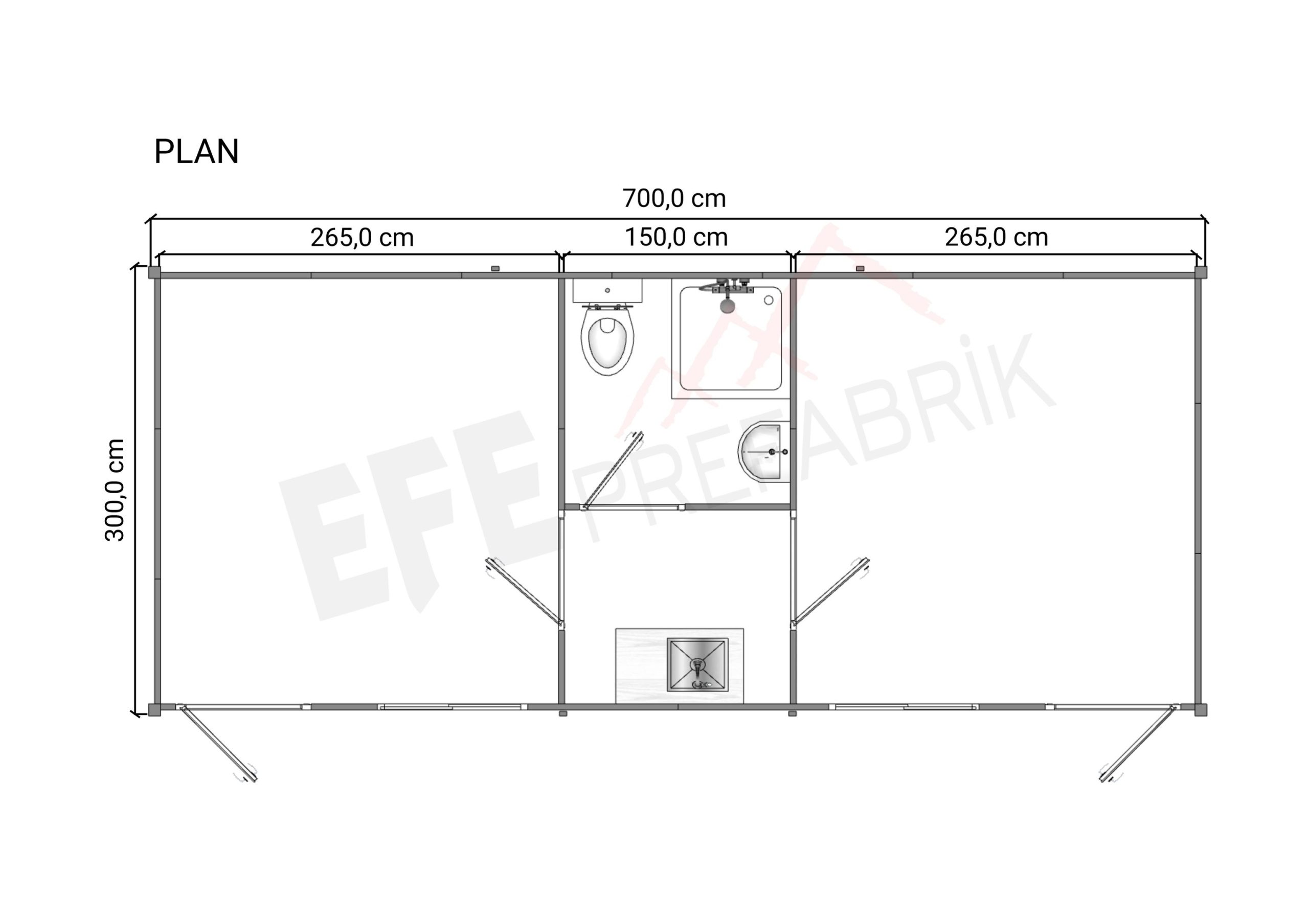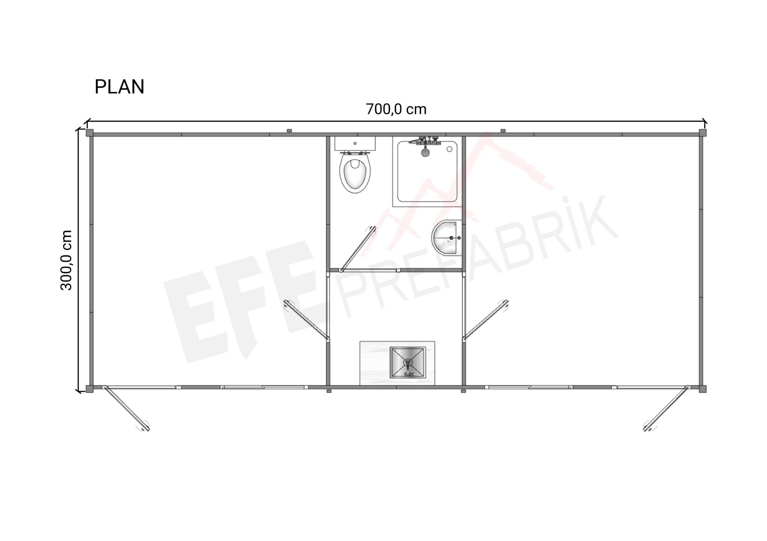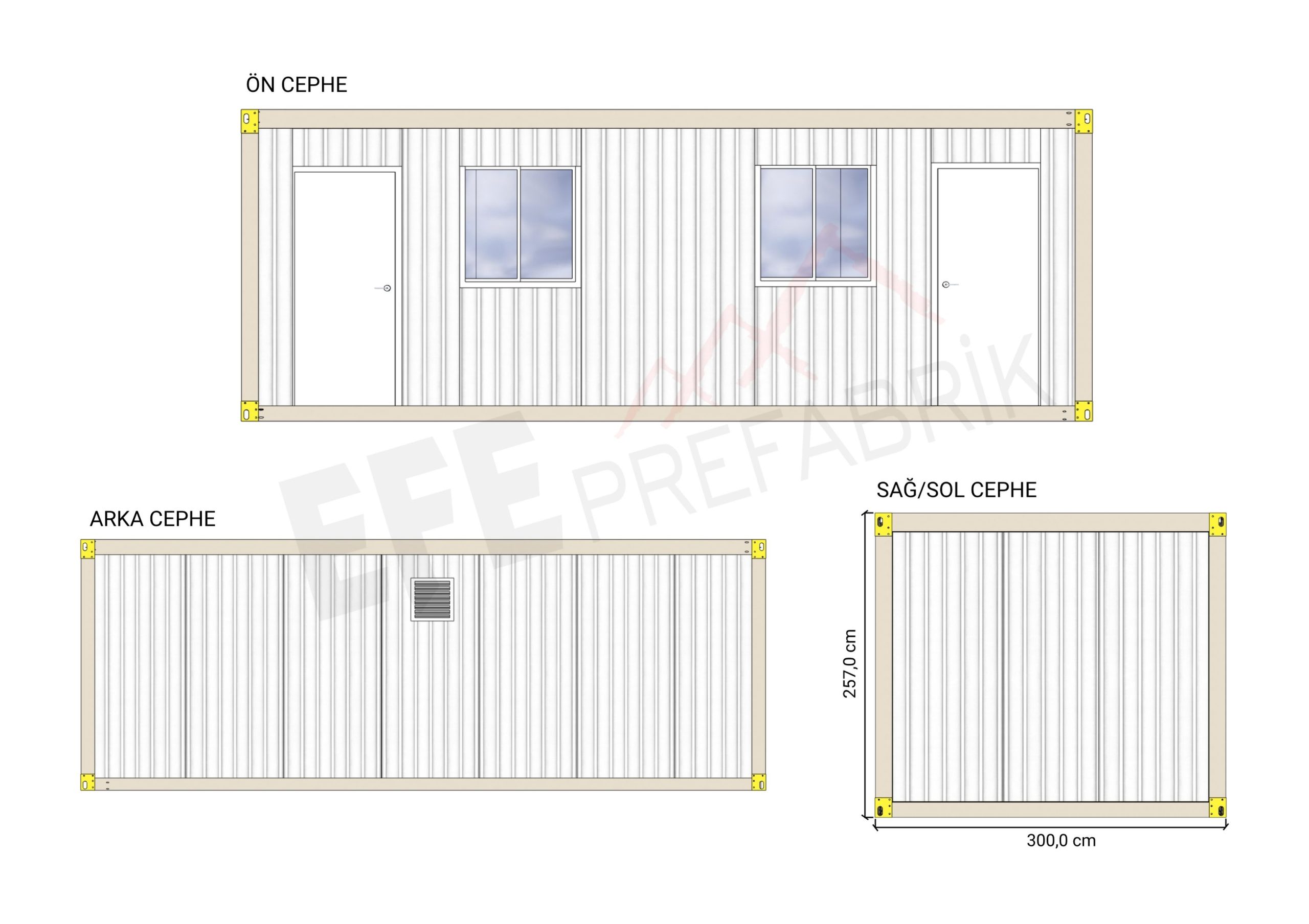 Konteyner tabanlarına güçlendirilmiş galvaniz şase üzerine 14 mm Fibercement kaplanmaktadır. Çürümez, esnemez!